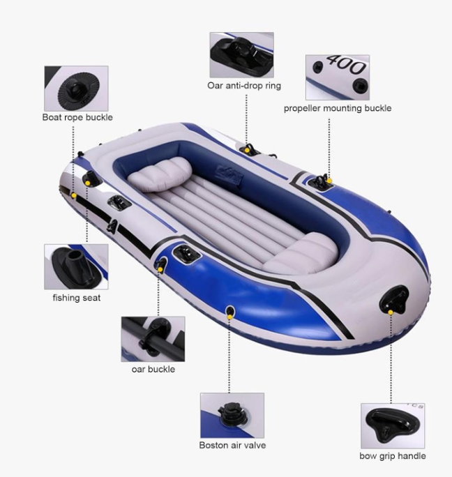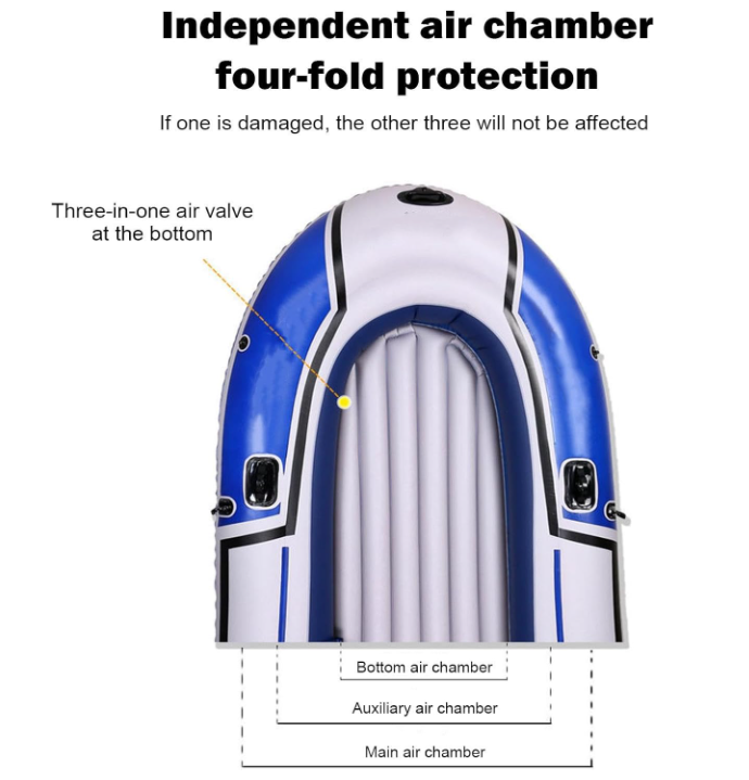 Ovaj čamac na napuhavanje za dvije osobe idealan je za rekreaciju na vodi, ribolov, izlete na jezero, more ili rijeku. Dizajniran je sa 4 odvojene zračne komore koje poboljšavaju stabilnost i sigurnost prilikom vožnje. Izrađen je od ojačanog PVC materijala, otpornog na habanje i kontakt sa vodom.